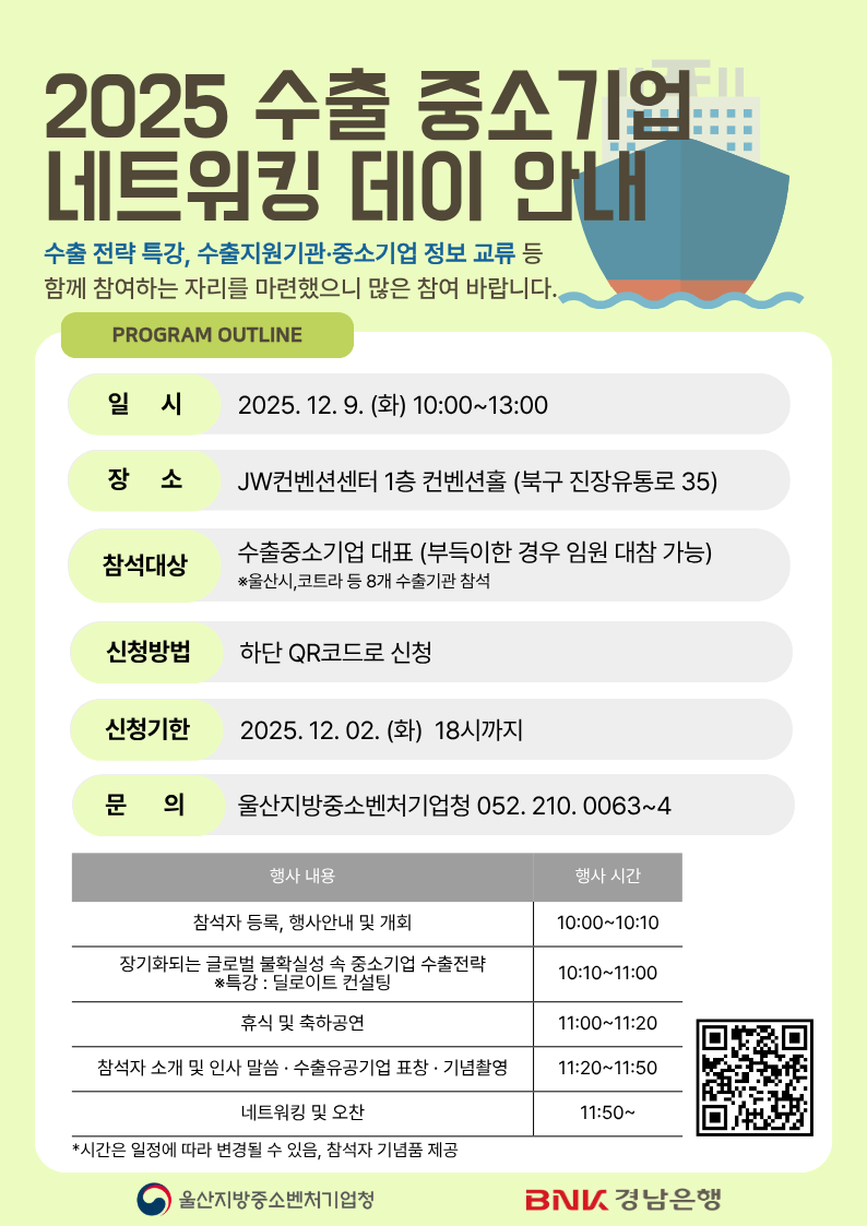 | 제목 | [울산지방중소벤처기업청] 2025 수출 중소기업 네트워킹 데이 개최 안내 | ||