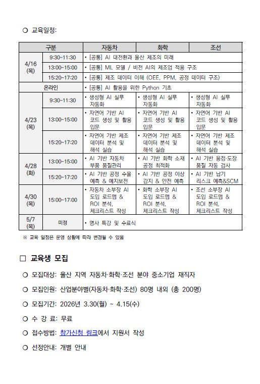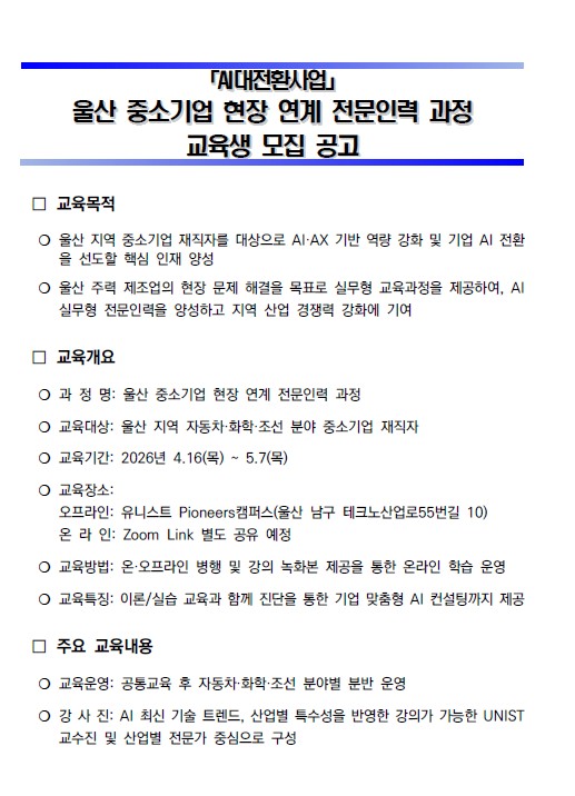| ‒ | (유니스트)AI대전환사업, 울산 중소기업 현장 연계 전문인력 과정 교육생 모집 |