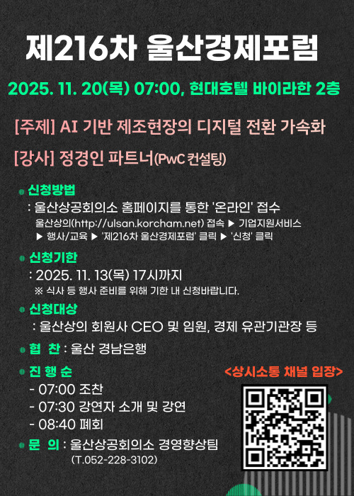 | ‒ | 제216차 울산경제포럼 'AI 기반 제조현장의 디지털 전환 가속화` |