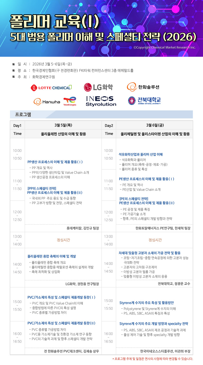 | ‒ | [화학경제연구원] 5대 범용 폴리머의 이해 및 스페셜티 전략 교육 안내 |